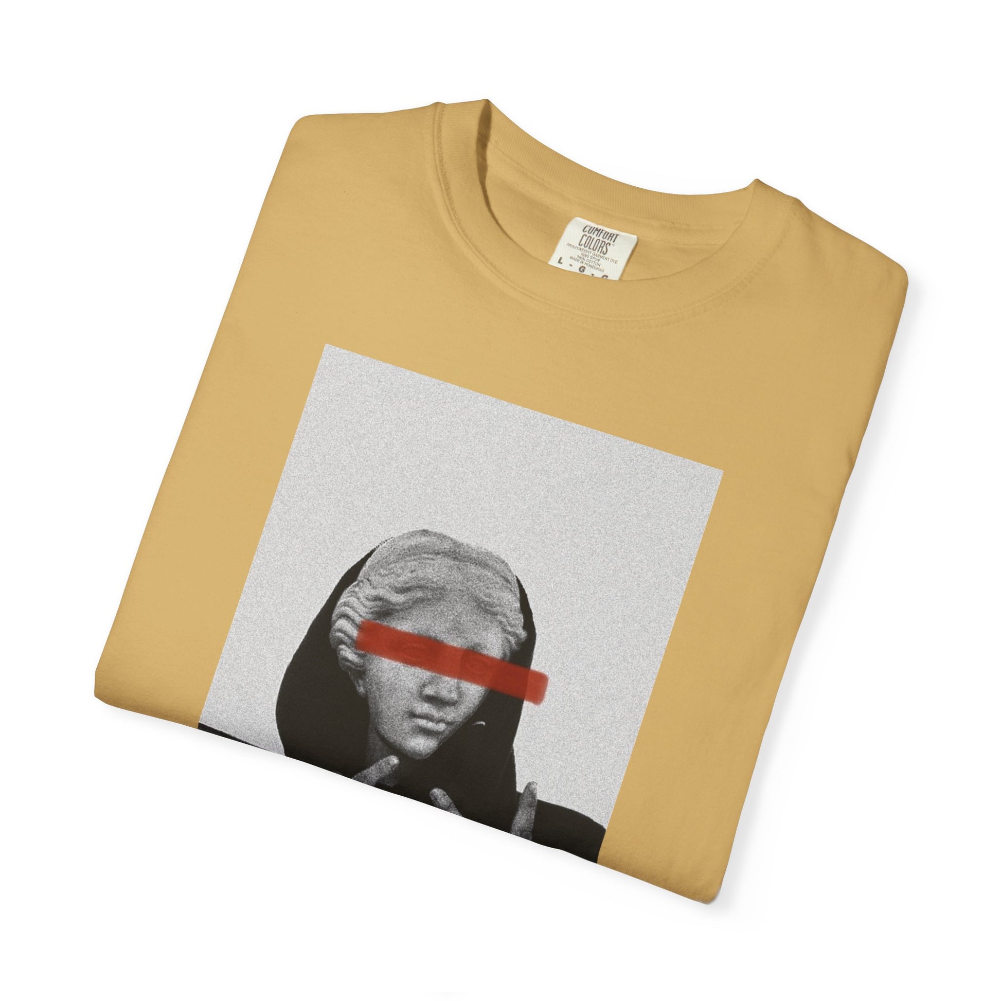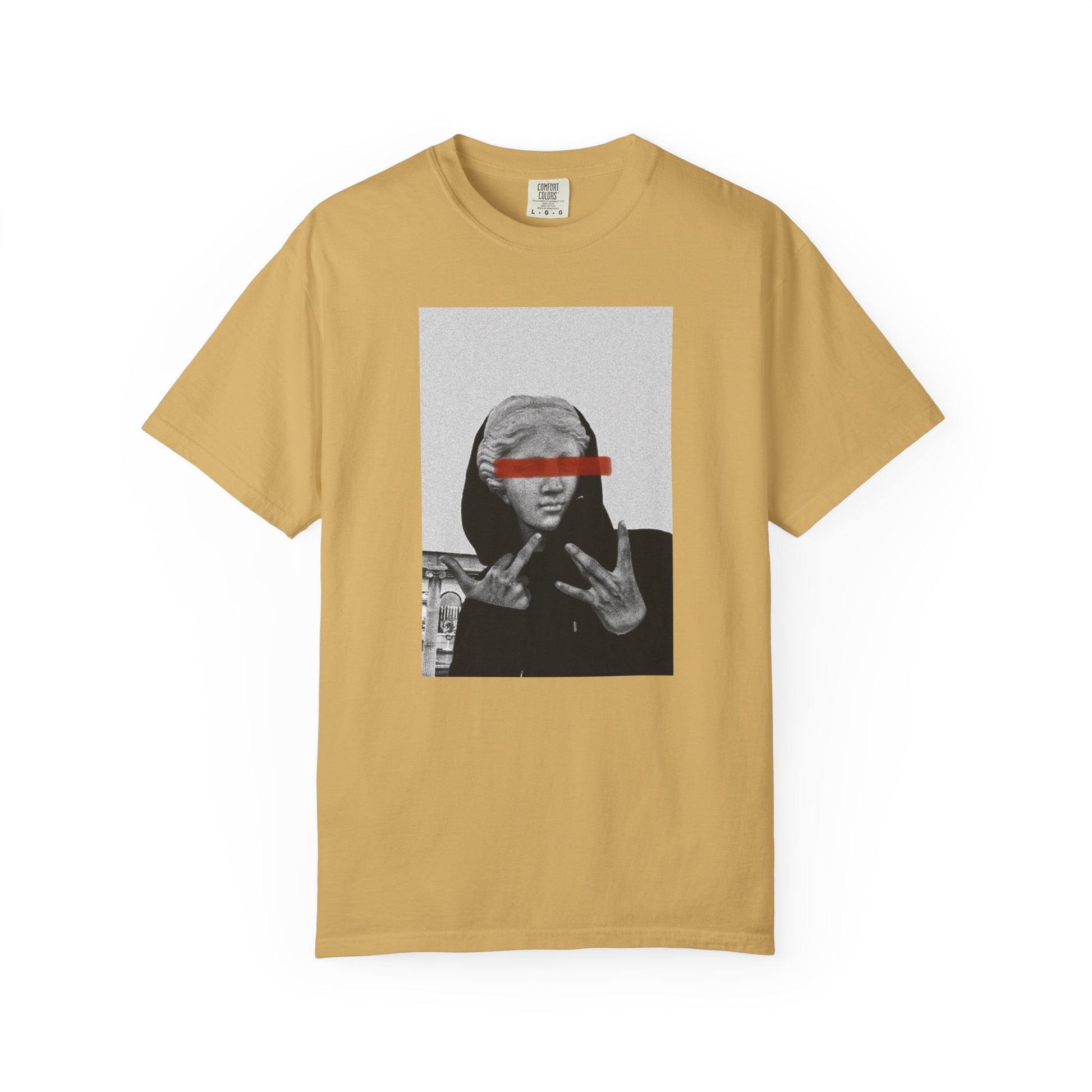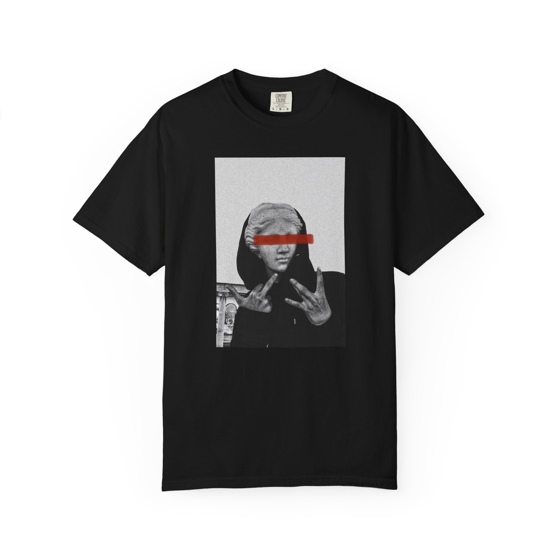 She came from marble and myth—but she’s throwing up signs now. Dressed in a hoodie with that red bar stare, this piece hits like a mixtape dropped in the Louvre.